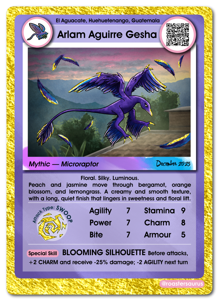 This is also the first time Swoop appears on a Roastersaurus card. Some earlier coffees expressed the same flowing movement in their cup profile, but the attack type had not yet been revealed. With Arlam Aguirre, the motion becomes official and the world expands in a new direction.