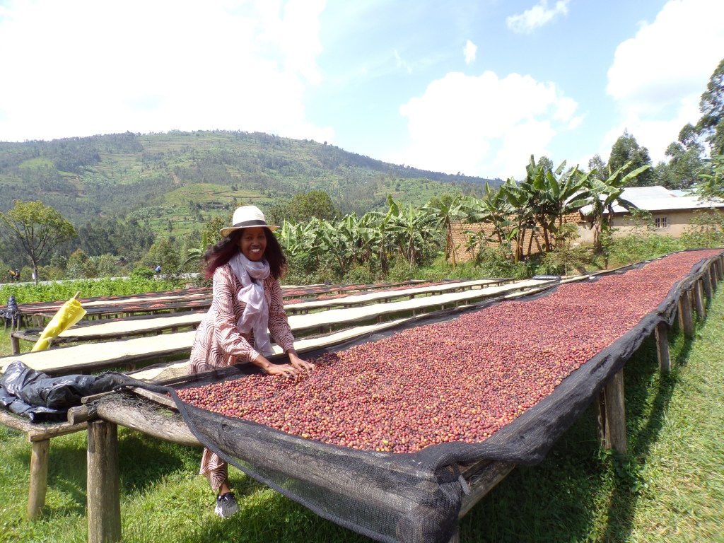 Her scarf carries stylised patterns inspired by Rwandan textiles, referencing the women who work with this coffee from harvest to drying beds. Raised beds stretch across the hills behind her. The rhythm of her step mirrors the rhythm of the process, steady, deliberate, alive.