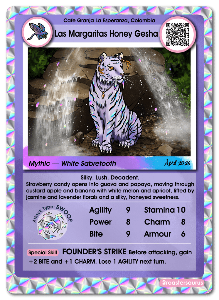 Each pack of Las Margaritas Honey Geisha includes its Roastersaurus Mythic White Sabertooth card.