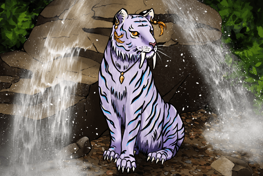 The Sabertooth carries subtle personal details that connect the creature to the Founder behind the release. Her eyes shine gold, and feather earrings hang from her ears, echoing those worn by Diana. Shimmering stripes run through her white fur, catching the light as she sits in stillness.